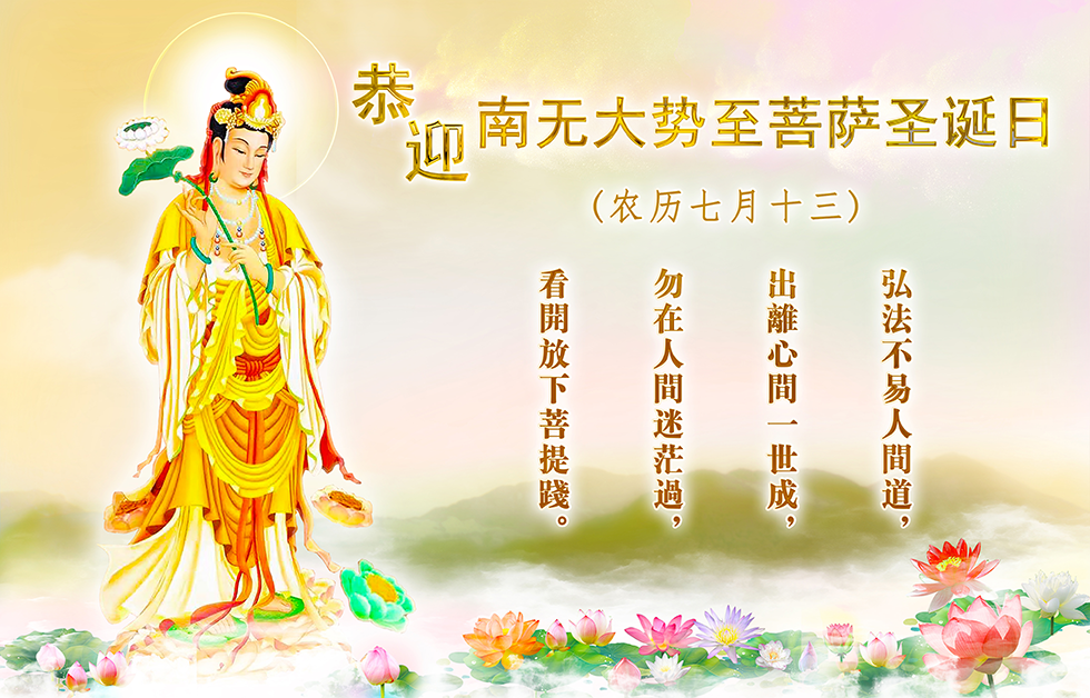 大势至菩萨是西方三圣之一,是西方极乐世界阿弥陀佛的右协侍者,每年的农历七月十三日是大势至菩萨圣诞。