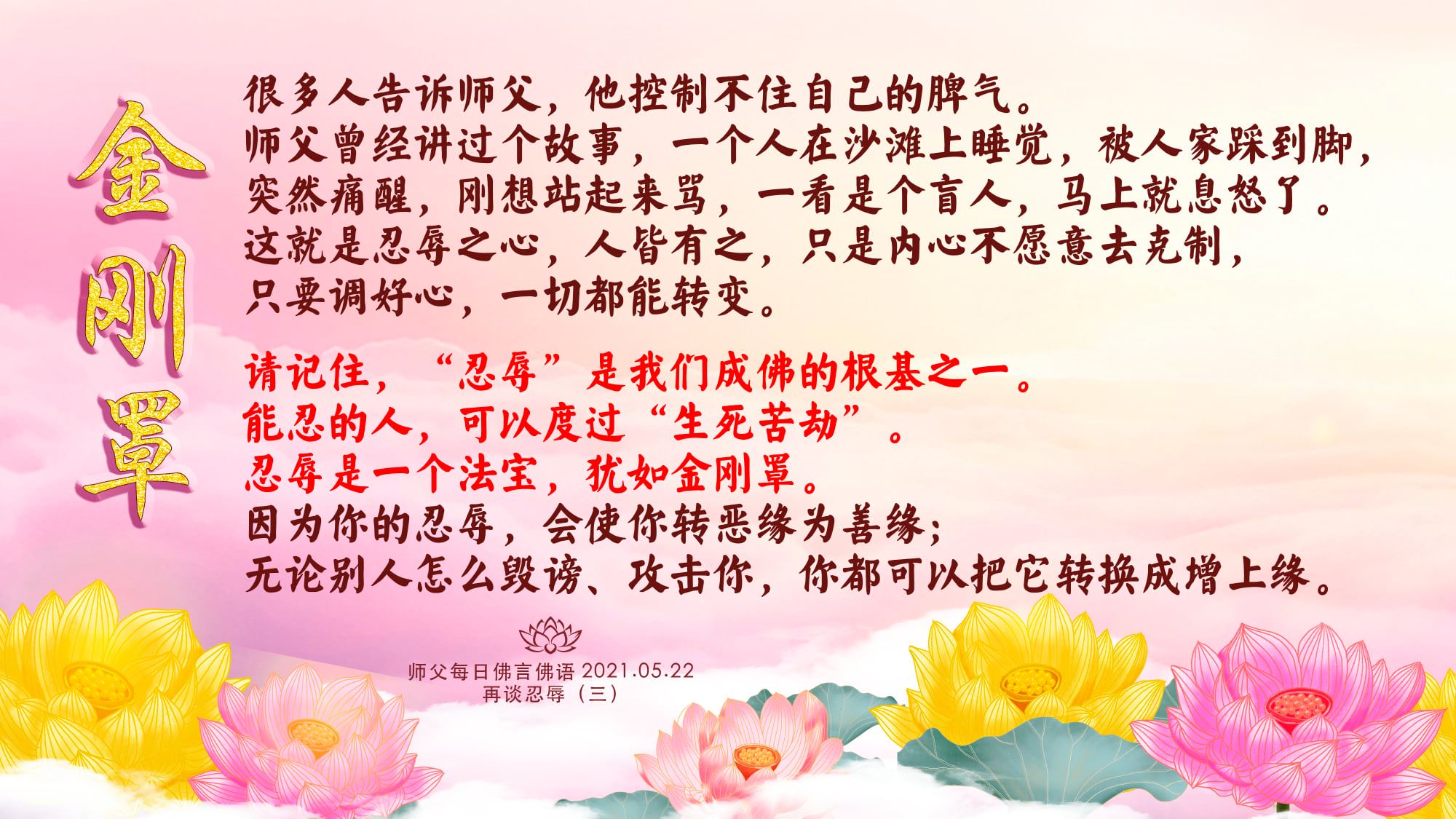 请记住,“忍辱”是我们成佛的根基之一。能忍的人,可以度过“生死苦劫”。忍辱是一个法宝,犹如金刚罩。因为你的忍辱,会使你转恶缘为善缘;无论别人怎么毁谤、攻击你,你都可以把它转换成增上缘。