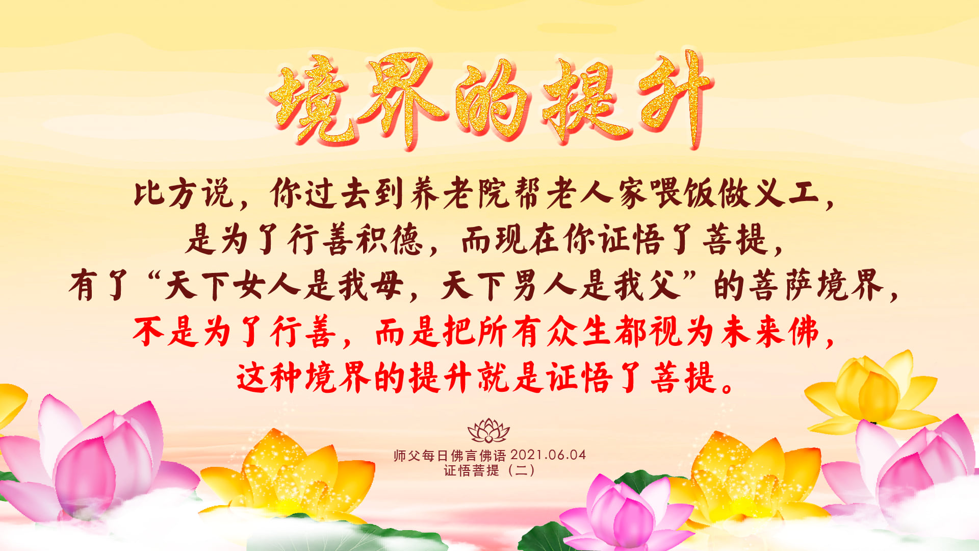 证悟菩提就是要减少自己的私心。佛陀在大乘佛法里曾提起,菩萨为了度化众生,发了菩提愿。菩提实际上就是一种境界。比方说,你过去到养老院帮老人家喂饭做义工,是为了行善积德,而现在你证悟了菩提,有了“天下女人是我母,天下男人是我父”的菩萨境界,不是为了行善,而是把所有众生都视为未来佛,这种境界的提升就是证悟了菩提。