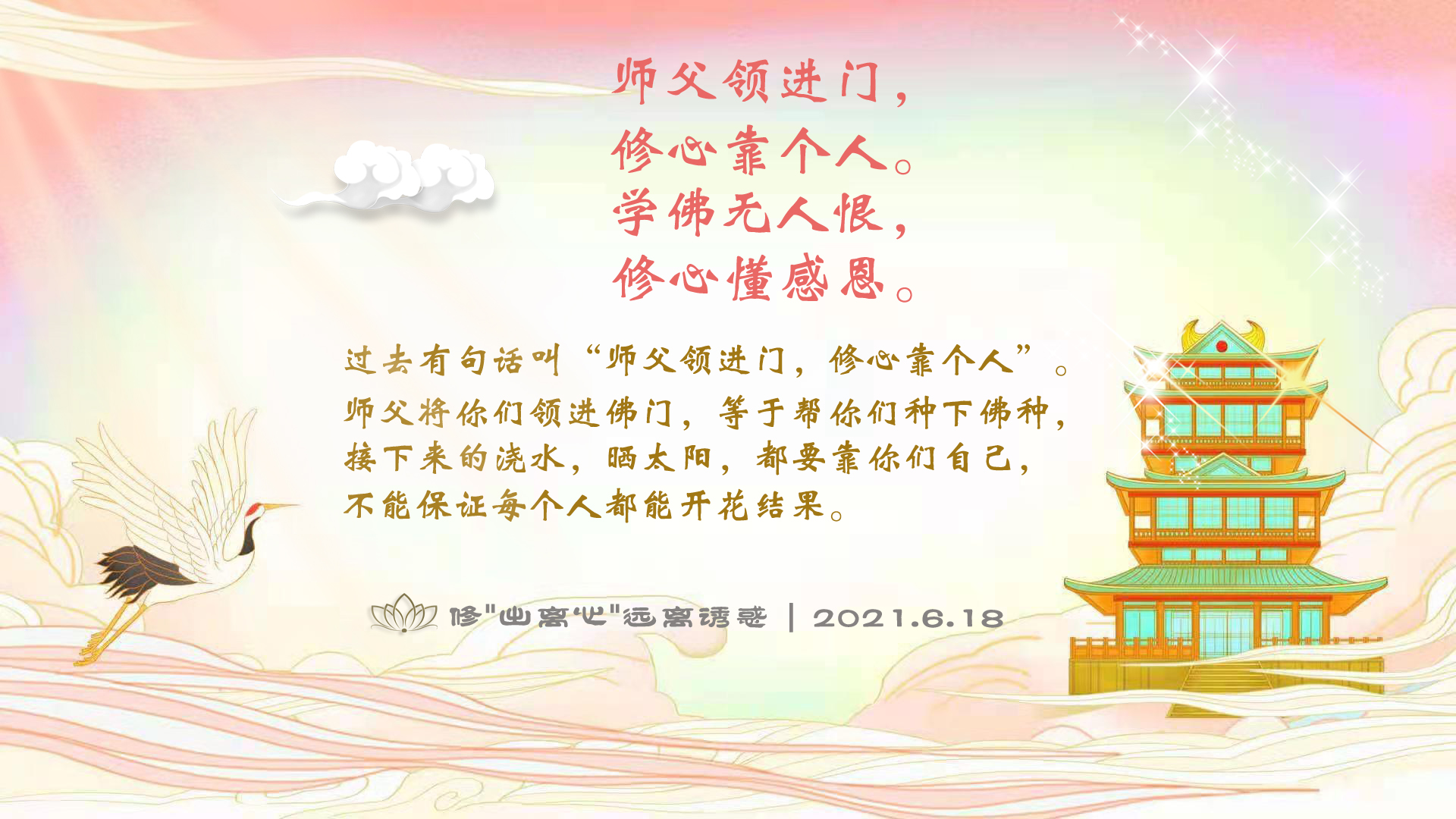 过去有句话叫“师父领进门,修心靠个人”。师父将你们领进佛门,等于帮你们种下佛种,接下来的浇水,晒太阳,都要靠你们自己,不能保证每个人都能开花结果。