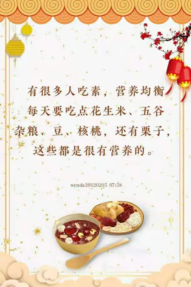 有很多人吃素,营养均衡,每天要吃点花生米、五谷杂 粮、豆、核桃,还有栗子,这些都是很有营养的。