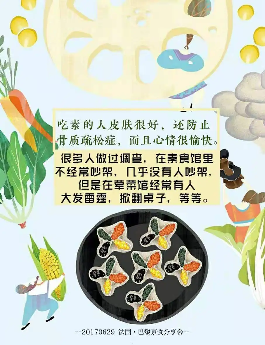 吃素的人皮肤很好,还防止骨质疏松症,而且心情很愉快。很多人做过调查,在素食馆里不经常吵架,几乎没有人吵架,但是在荤菜馆经常有人大发雷霆,掀翻桌子,等等。