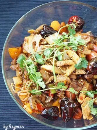 3. 锅内再放少许油,下杏鲍菇、豆腐、土豆、胡萝卜、笋、腐竹,煎一下,装碗备用;