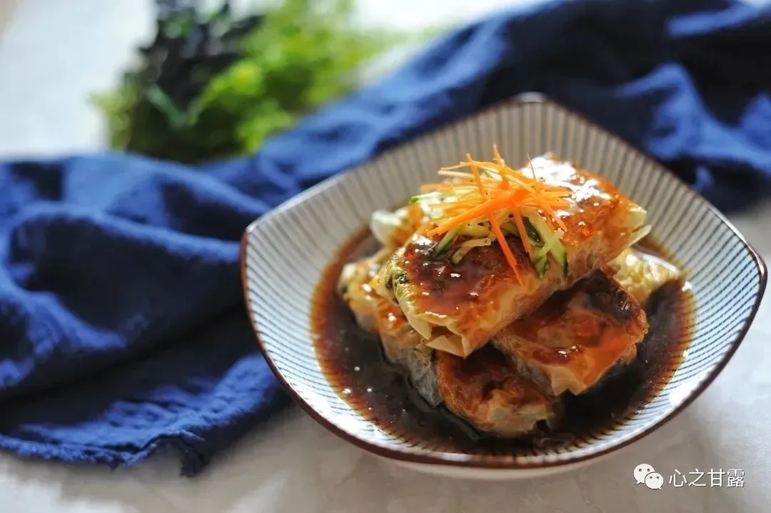 12、将调好的芡汁淋在蒸好的腐皮卷上就完成啦~