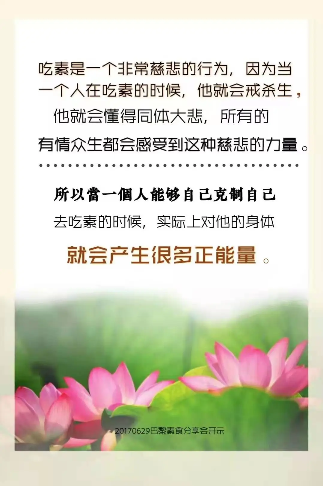 吃素是一个非常慈悲的行为,因为当一个人在吃素的时候,他就会戒杀生,他就会懂得同体大悲,所有的有情众生都会感受到这种慈悲的力量。所以當一個人能够自己克制自己去吃素的时候,实际上对他的身体就会产生很多正能量。