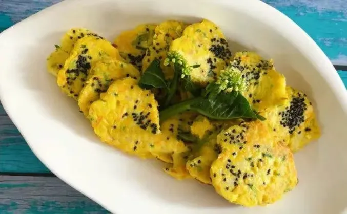 2、油锅烧热,把豆腐泥放入你喜欢的模具中,撒点黑芝麻,两面煎至金黄出锅,摆盘即可。