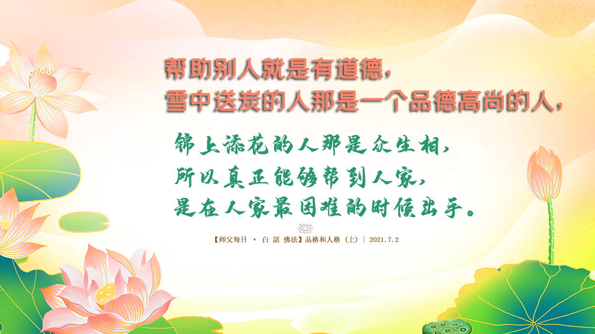 这就是现在人的心。锦上添花那是虚荣者,实实在在雪中送炭那是真的帮助别人。你要是用心做事说话,你不可能在人家落难的时候不帮助别人,菩萨永远不会做这样的事情。所以希望大家一定要好好学习佛法的精神,众善奉行,诸恶莫作,人伤我痛,别人的痛苦就是我的痛苦,别人受难就像我受难一样,这样才是真正的菩萨。