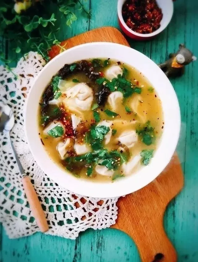 10.现在就可以下云吞啦,同时往碗内放入香菜末、芝麻酱、麻油、盐、生抽少许、自制辣油少许、倒入烧混沌的开水,制成汤料。
