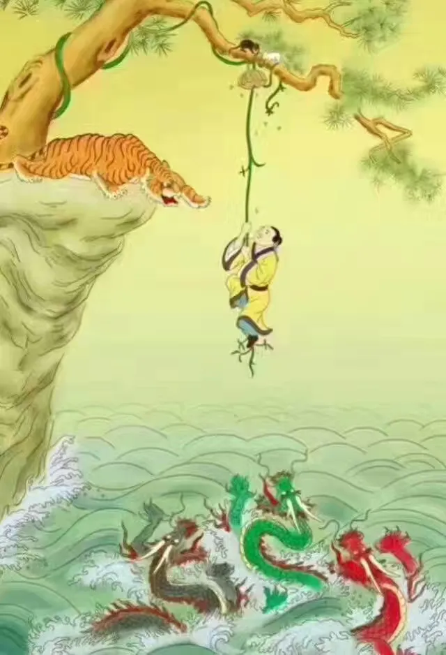 在荒野当中,有一个人赶着路,突然他发现一块块白白的东西,仔细一看,原来是白骨。正在疑惑之际,突然传来惊人的咆哮声——一只大老虎紧逼而来。他拔腿就逃,但迷失了方向,他逃啊逃啊,居然逃到了一座断崖绝壁的顶上,幸好断崖上有一棵松树,从树枝上垂下了一条蔓藤,他抓着蔓藤慢慢地垂下去。