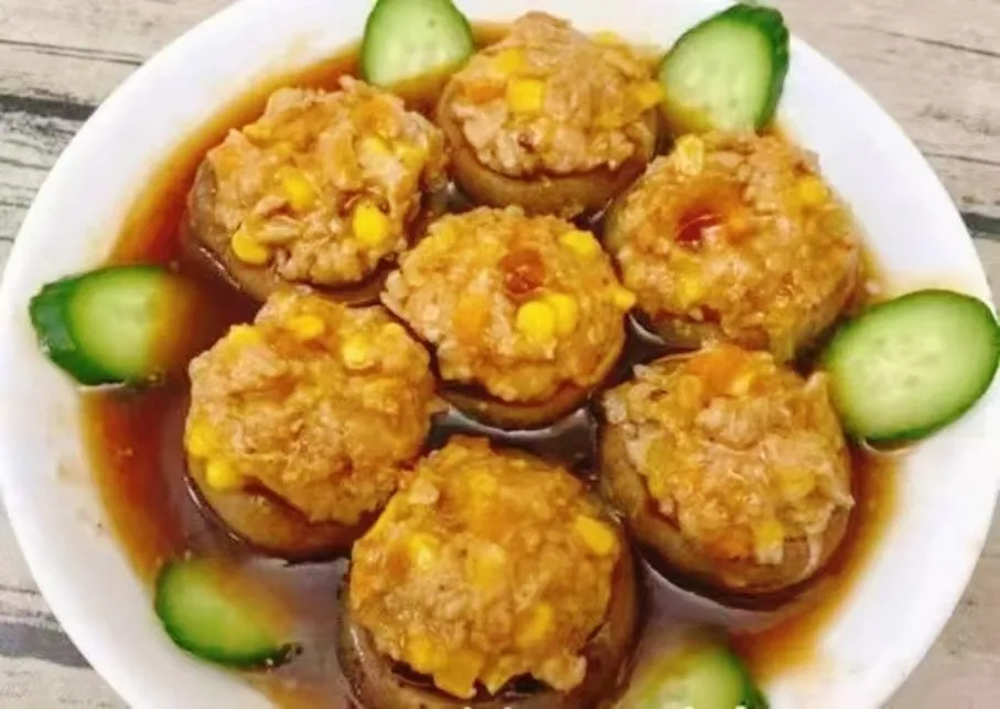 2.将拌好的食材做成圆球状,放在洗净的生香菇上面;