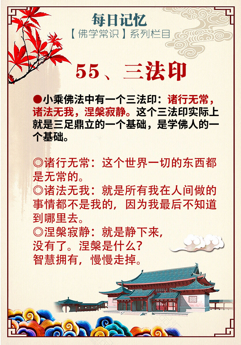 小乘佛法中有一个三法印:诸行无常,诸法无我,涅槃寂静。这个三法印实际上就是三足鼎立的一个基础,是学佛人的一个基础。