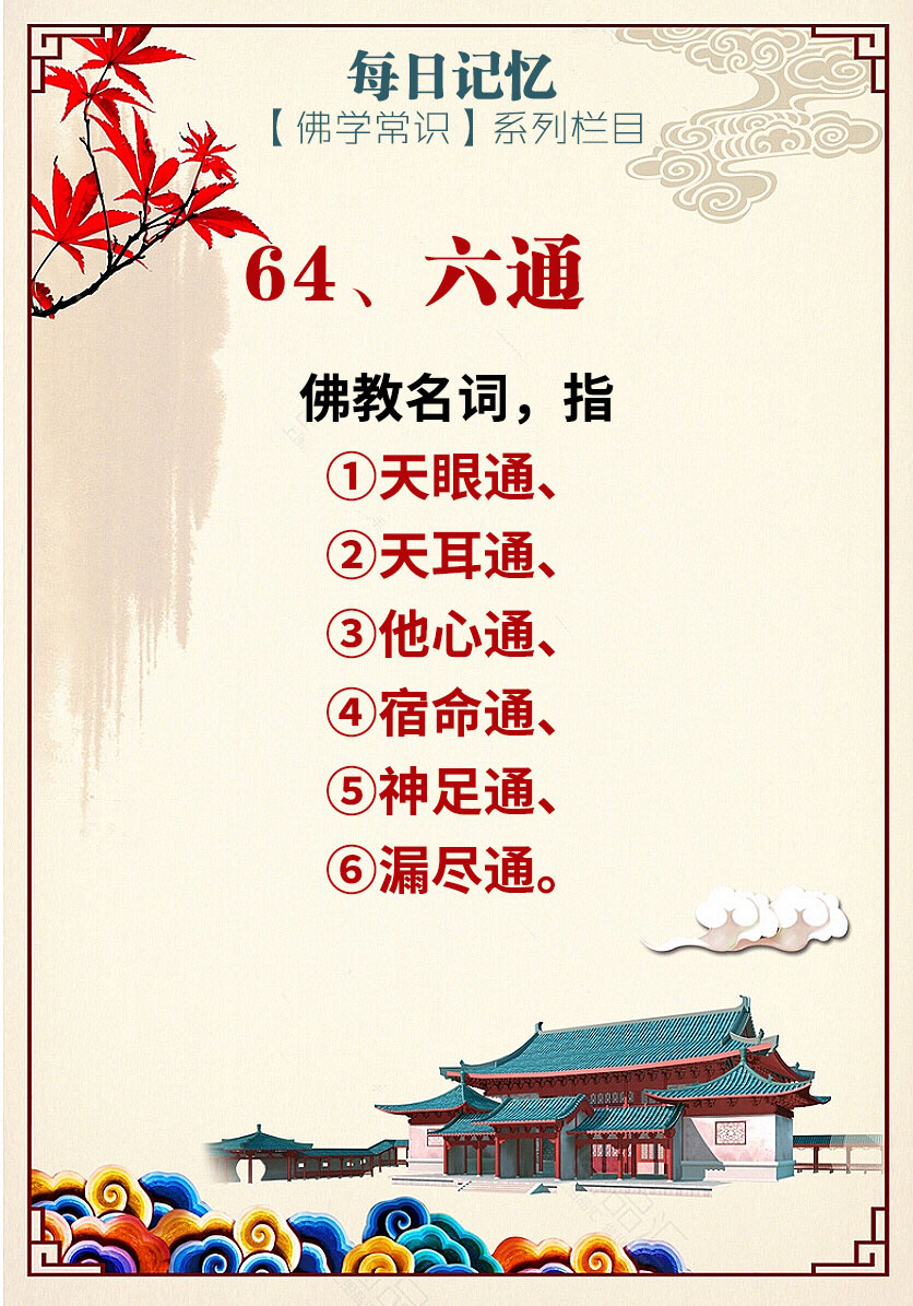 6)漏尽通,全称为“漏尽智证通”。就是自己能断除烦恼,把自己不好的东西消除漏尽,把人间的东西全部漏尽,能自己断除烦恼。如果能想得开,能断除烦恼,就是菩萨的境界。前五通比较容易做到,如果能达到漏尽通的最高境界,就是佛菩萨了。如果能断除烦恼,前五通就不需要了,你能自己解决问题,想通了,还要五通干吗?如果五通能全部达到,就是仙人,即五通为仙,六通是佛菩萨。