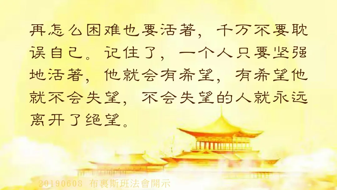 有一些人不相信轮回,不相信因果,觉得世界上人死了就没有了。想一想,很多人死了,为什么过世的人还会被梦到呢?实际上就是有一种神秘的力量。如果你否定终极的存在,你就堕入了佛法的断灭论,这就是为什么现在每年有 100 万人自sha的缘故。因为那些人认为“我自sha了,我一了百了,没事了”。师父告诉你们,你自sha了,你可能到下面去了,受更多的苦难。所以再怎么困难也要活着,千万不要耽误自己。记住了,一个人只要坚强地活着,他就会有希望,有希望他就不会失望,不会失望的人就永远离开了绝望。