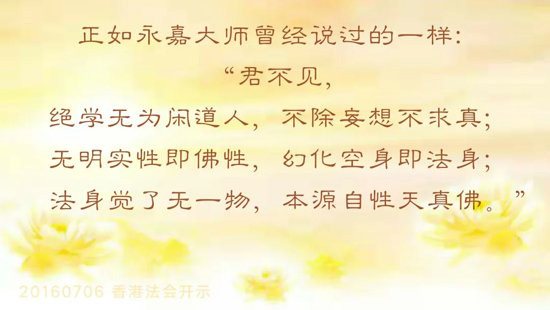 正如永嘉大师曾经说过的一样:“君不见,绝学无为闲道人,不除妄想不求真;无明实性即佛性,幻化空身即法身;法身觉了无一物,本源自性天真佛。”记住了:好好听,学佛学佛就要学,修心修心就要修。就是因为不懂才要找师父。