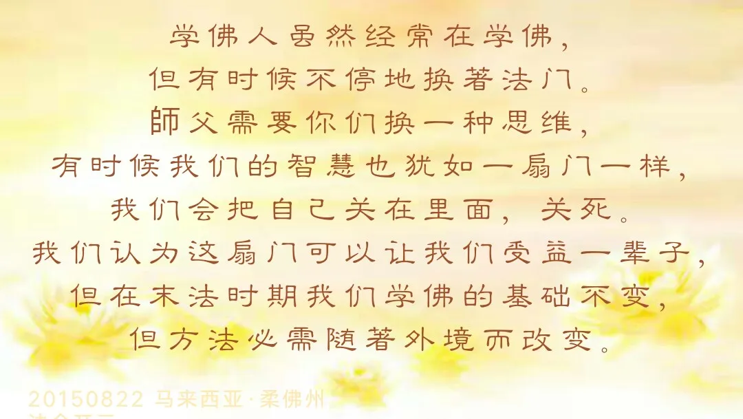 这个故事就是告诉大家我们,学佛人虽然经常在学佛,但有时候不停地换着法门。师父需要你们换一种思维,有时候我们的智慧也犹如一扇门一样,我们会把自己关在里面,关死。我们认为这扇门可以让我们受益一辈子,但在末法时期我们学佛的基础不变,但方法必需随着外境而改变。