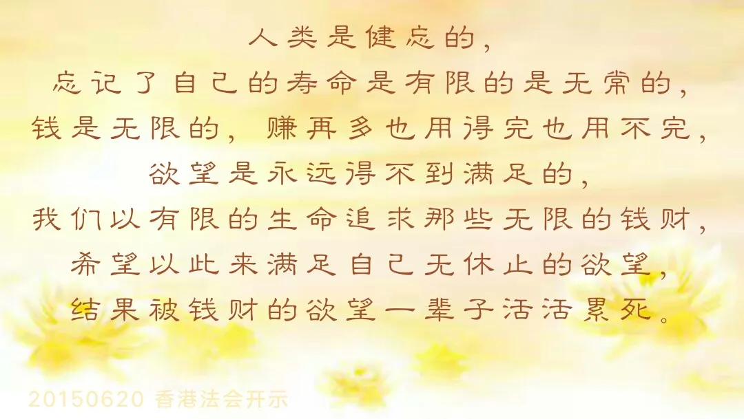 当年有人问佛陀:“通过修心,你究竟得到了什么?”佛陀说:“我什么都没有得到。”这人说:“那你还修心做什么?”佛陀微笑着说:“不过我可以告诉你我失去的东西,我失去愤怒、忧虑、悲观、沮丧、焦虑不安,我失去自私自利的贪瞋痴三毒,失去了凡夫俗子的一切无知和习气业障,我也失去了对老去和死亡的恐惧。”佛陀说知足常乐,但是人常讨论的是“多少年以后我要怎样, 我事业要怎样,我以后财政要怎样、赚钱要怎样……”人类是健忘的,忘记了自己的寿命是有限的是无常的,钱是无限的,赚再多也用得完也用不完,欲望是永远得不到满足的,我们以有限的生命追求那些无限的钱财,希望以此来满足自己无休止的欲望,结果被钱财的欲望一辈子活活累死。