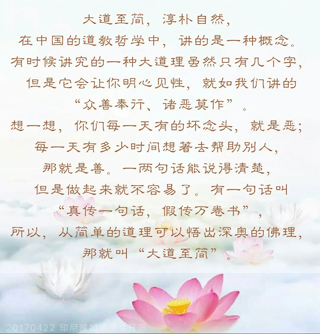 这个故事告诉我们,我们人的心中全部都有慈悲心和佛性,我们要想好好地把自己心中的金子挖出来,就要好好地去珍惜它。大道至简,淳朴自然,在中国的道教哲学中,讲的是一种概念。有时候讲究的一种大道理虽然只有几个字,但是它会让你明心见性,就如我们讲的“众善奉行、诸恶莫作”。想一想,你们每一天有的坏念头,就是恶;每一天有多少时间想着去帮助别人,那就是善。一两句话能说得清楚,但是做起来就不容易了。有一句话叫“真传一句话,假传万卷书”,所以,从简单的道理可以悟出深奥的佛理,那就叫“大道至简”。