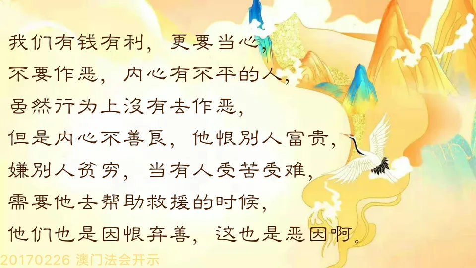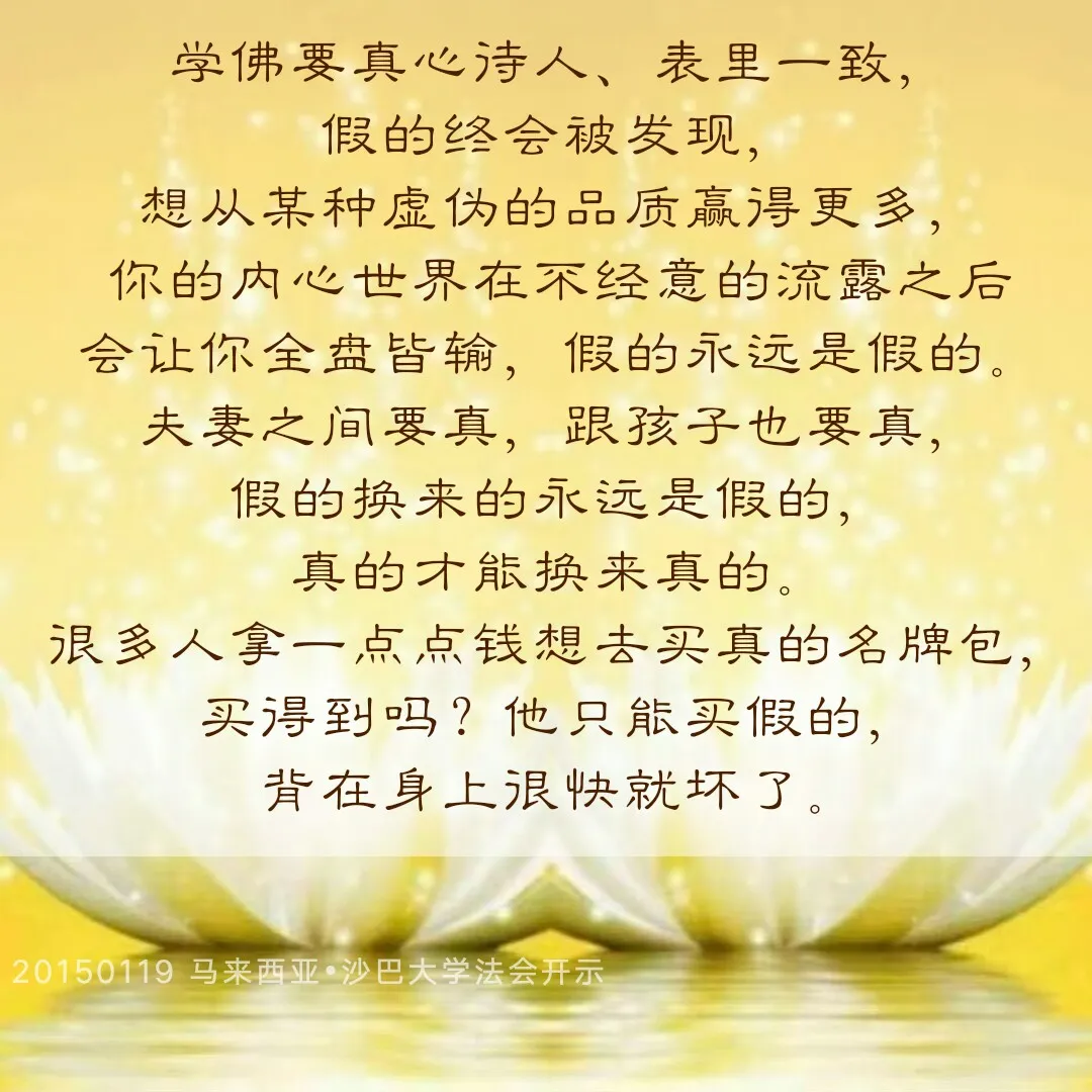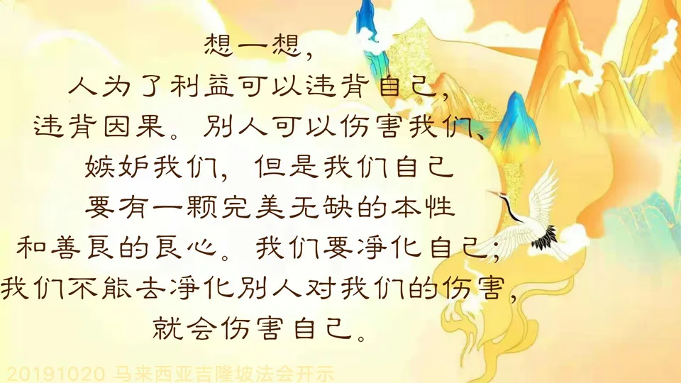 想一想,人为了利益可以违背自己,违背因果。别人可以伤害我们、嫉妒我们,但是我们自己要有一颗完美无缺的本性和善良的良心。我们要净化自己;我们不能去净化别人对我们的伤害,就会伤害自己。希望每一个学佛的人,用自己慈悲的真心去帮助曾经伤害你的人,这样你可以安抚自己这颗曾经受过伤的心灵。