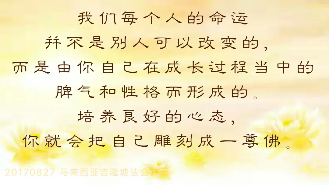 这个故事就是告诉我们,我们每个人的命运并不是别人可以改变的,而是由你自己在成长过程当中的脾气和性格而形成的。培养良好的心态,你就会把自己雕刻成一尊佛。