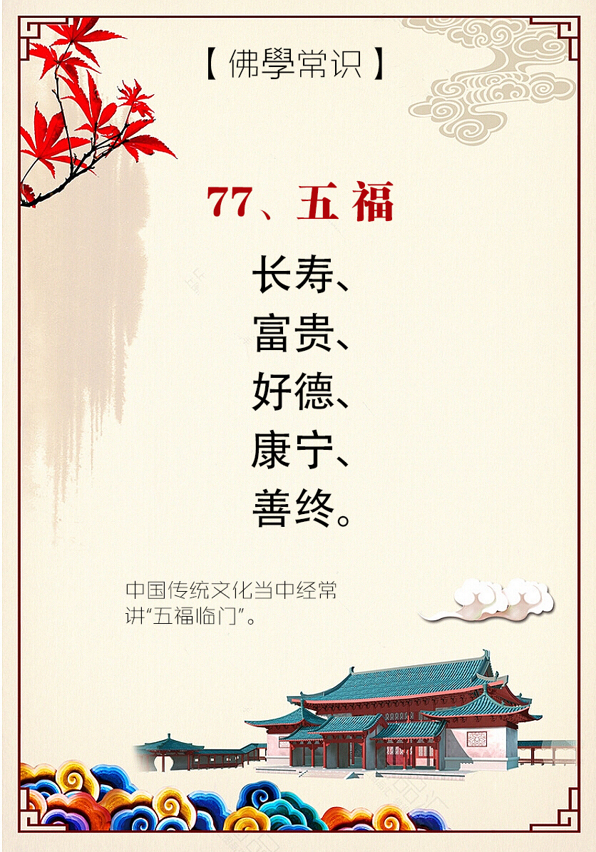 长寿、富贵、好德、康宁、善终。有五种福气,
