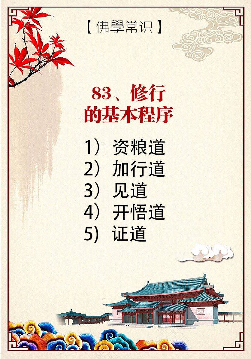 修行的基本程序:资粮道 2)加行道 3)见道 4)开悟道 5) 证道