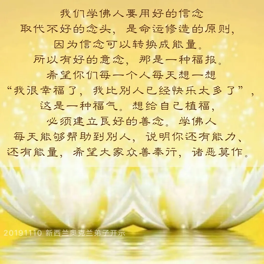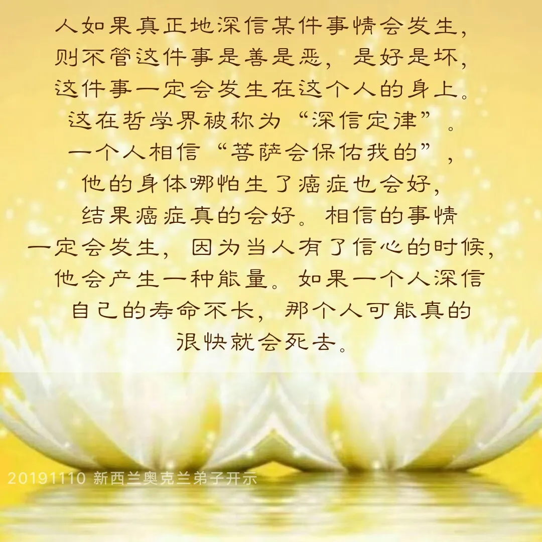 人如果真正地深信某件事情会发生,则不管这件事是善是恶,是好是坏,这件事一定会发生在这个人的身上。这在哲学界被称为“深信定律”。一个人相信“菩萨会保佑我的”,他的身体哪怕生了癌症也会好,结果癌症真的会好。相信的事情一定会发生,因为当人有了信心的时候,他会产生一种能量。如果一个人深信自己的寿命不长,那个人可能真的很快就会死去。我们学佛人要用好的信念取代不好的念头,是命运修造的原则,因为信念可以转换成能量。所以有好的意念,那是一种福报。希望你们每一个人每天想一想“我很幸福了,我比别人已经快乐太多了”,这是一种福气。想给自己植福,必须建立良好的善念。学佛人每天能够帮助到别人,说明你还有能力、还有能量,希望大家众善奉行,诸恶莫作。