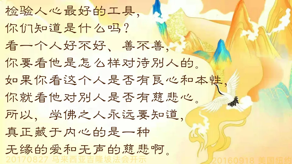 现代人把名和钱看得比感情都重,自私自利,为了达到自己的目的不惜一切。我们的母亲非常伟大,每一个母亲都是非常伟大。曾听人说过一件事情,有一个母亲,天太热了,孩子吵闹着跟妈妈说:“妈妈买西瓜,妈妈买西瓜。”妈妈转了一大圈,终于买回来一个大西瓜,切开之后,妈妈先尝了一口,没想到孩子在边上大叫:“谁让你吃了我的西瓜?你给我吐出来!你给我吐出来!”母亲流泪了。人生如天气,可以预料,但是往往又出乎意料。我们学佛做人要懂得感恩,因为感恩是慈悲的基础。你们来到新加坡,他们为你们准备了这么多的餐饮餐食,接待你们,你们如果有感恩心,你们就是拥有菩提心。