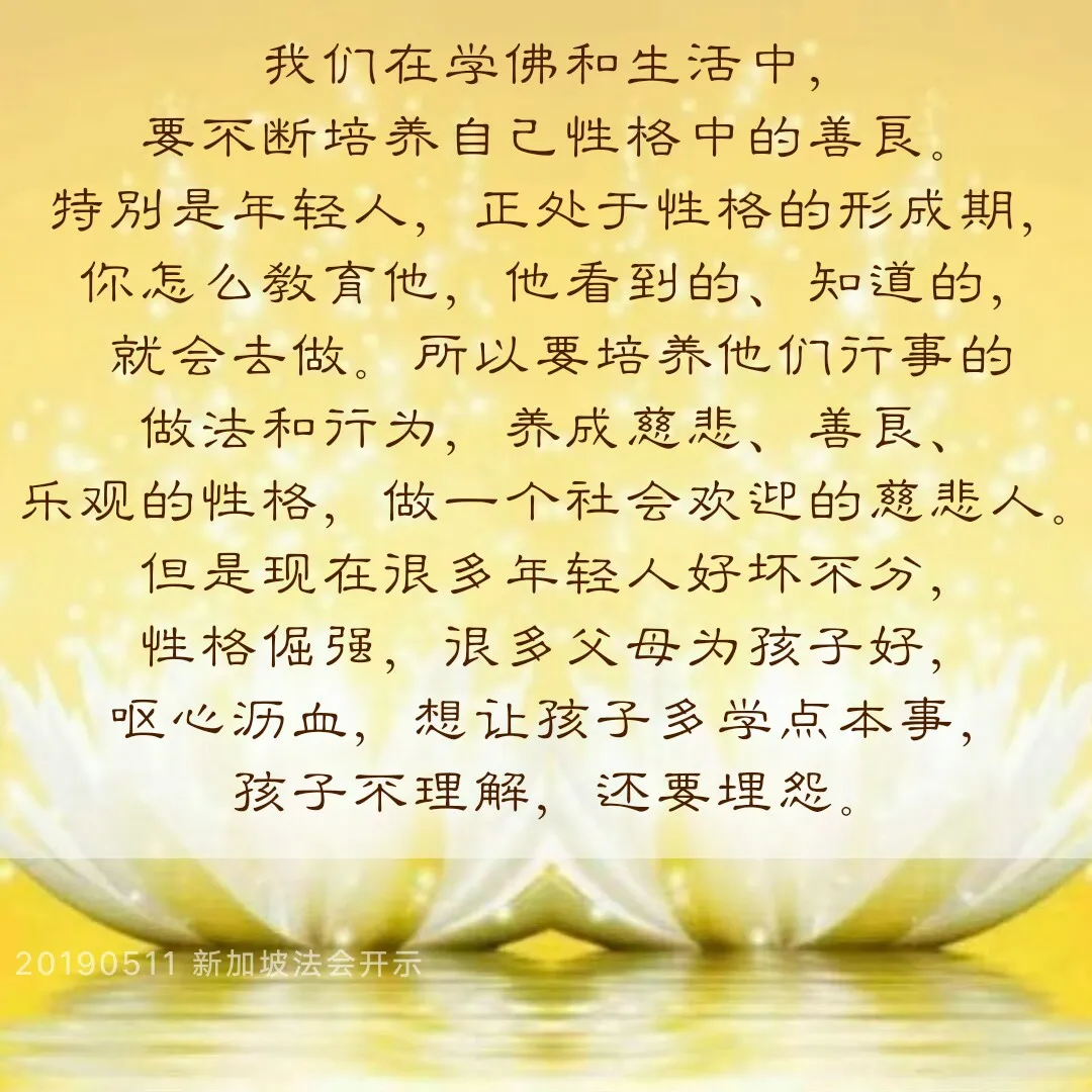 性格决定命运。一个自私心重的人,注定了他烦恼的命运。我们在学佛和生活中,要不断培养自己性格中的善良。特别是年轻人,正处于性格的形成期,你怎么教育他,他看到的、知道的,就会去做。所以要培养他们行事的做法和行为,养成慈悲、善良、乐观的性格,做一个社会欢迎的慈悲人。但是现在很多年轻人好坏不分,性格倔强,很多父母为孩子好,呕心沥血,想让孩子多学点本事,孩子不理解,还要埋怨。