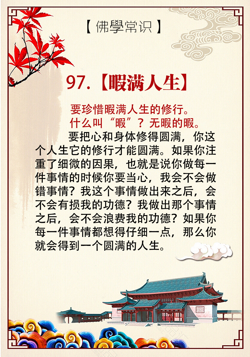 要珍惜暇满人生的修行。什么叫“暇”?无暇的暇。要把心和身体修得圆满,你这个人生它的修行才能圆满。如果你注重了细微的因果,也就是说你做每一件事情的时候你要当心,我会不会做错事情?我这个事情做出来之后,会不会有损我的功德?我做出那个事情之后,会不会浪费我的功德?如果你每一件事情都想得仔细一点,那么你就会得到一个圆满的人生。