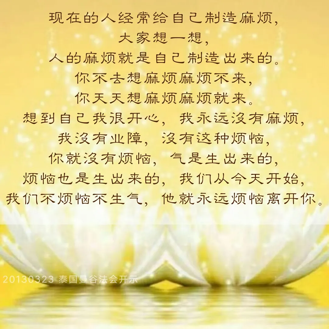 所以同样一句话,就是人应该有智慧,要解决很多问题。现在的人经常给自己制造麻烦,大家想一想,人的麻烦就是自己制造出来的,你不去想麻烦麻烦不来,你天天想麻烦麻烦就来。想到自己我很开心,我永远没有麻烦,我没有业障,没有这种烦恼,你就没有烦恼,气是生出来的,烦恼也是生出来的,我们从今天开始,我们不烦恼不生气,他就永远烦恼离开你。