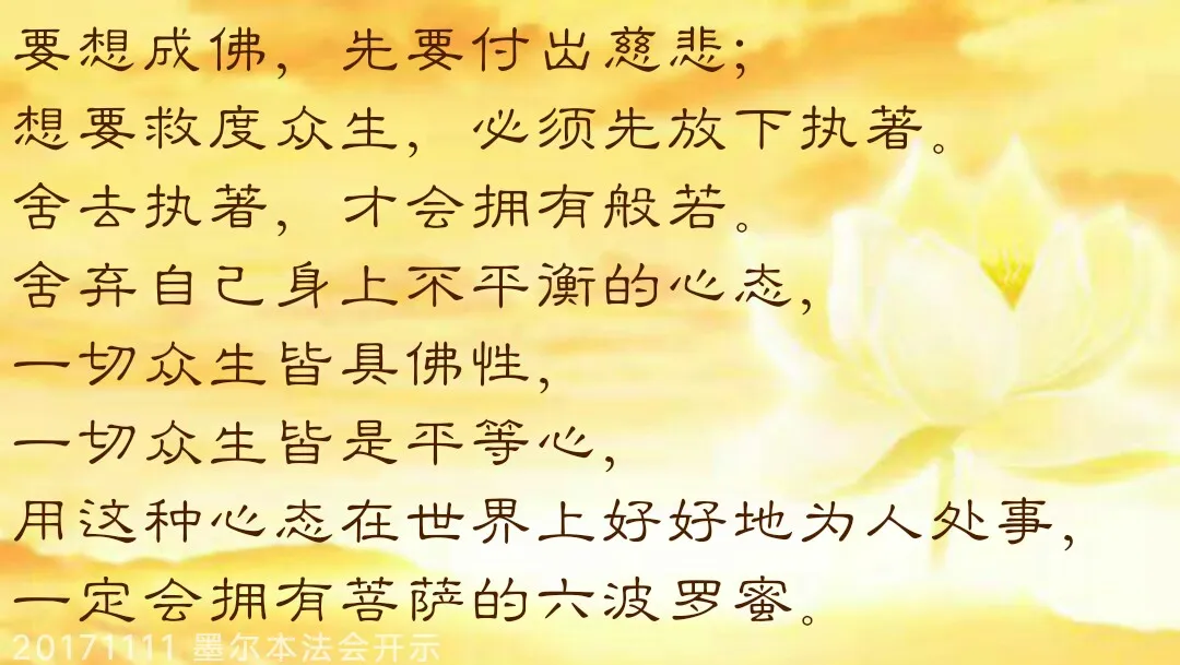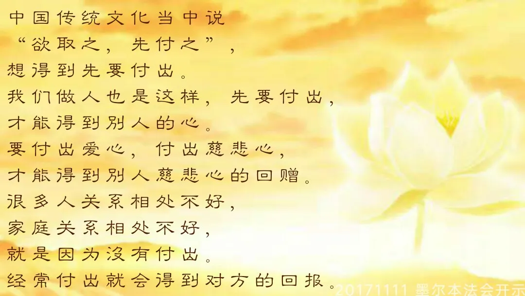 这个小故事告诉我们中国传统文化当中说“欲取之,先付之”,想得到先要付出。我们做人也是这样,先要付出,才能得到别人的心。要付出爱心,付出慈悲心,才能得到别人慈悲心的回赠。很多人关系相处不好,家庭关系相处不好,就是因为没有付出。经常付出就会得到对方的回报。要想成佛,先要付出慈悲;想要救度众生,必须先放下执著。舍去执著,才会拥有般若。舍弃自己身上不平衡的心态,一切众生皆具佛性,一切众生皆是平等心,用这种心态在世界上好好地为人处事,一定会拥有菩萨的六波罗蜜。