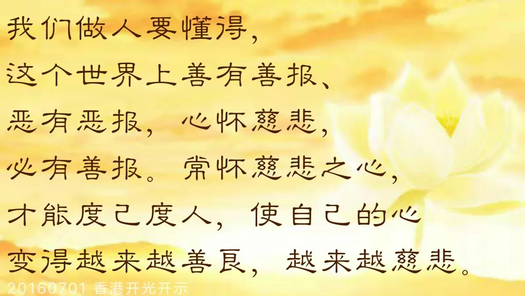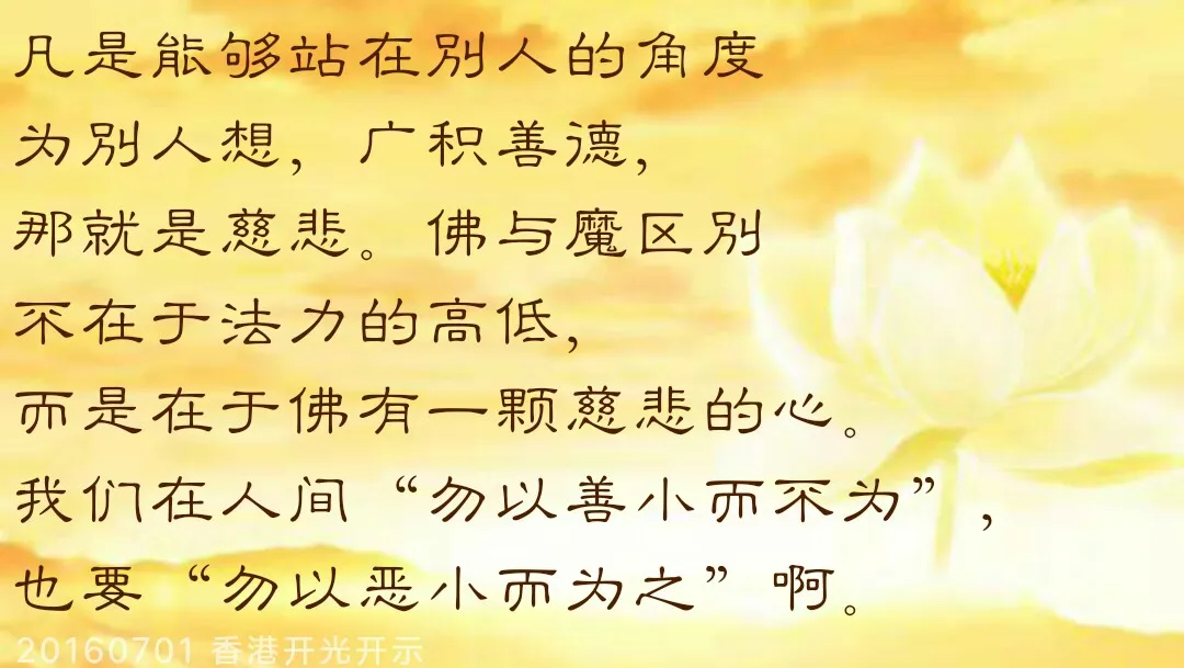 凡是能够站在别人的角度为别人想,广积善德,那就是慈悲。佛与魔区别不在于法力的高低,而是在于佛有一颗慈悲的心。我们在人间“勿以善小而不为”,也要“勿以恶小而为之”啊。我们做人要懂得,这个世界上善有善报、恶有恶报,心怀慈悲,必有善报。常怀慈悲之心,才能度己度人,使自己的心变得越来越善良,越来越慈悲。