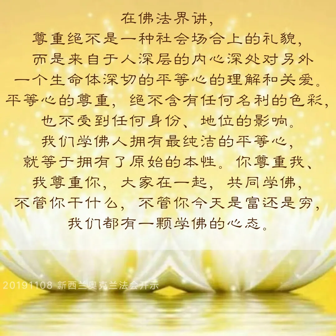 所以在佛法界讲,尊重绝不是一种社会场合上的礼貌,而是来自于人深层的内心深处对另外一个生命体深切的平等心的理解和关爱。平等心的尊重,绝不含有任何名利的色彩,也不受到任何身份、地位的影响。我们学佛人拥有最纯洁的平等心,就等于拥有了原始的本性。你尊重我、我尊重你,大家在一起,共同学佛,不管你干什么,不管你今天是富还是穷,我们都有一颗学佛的心态。