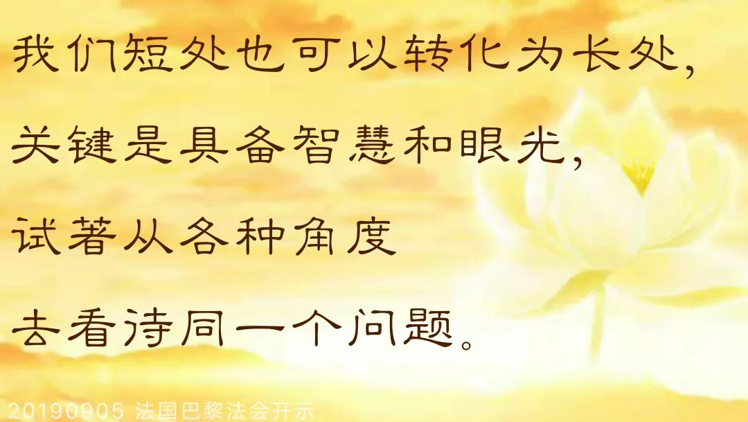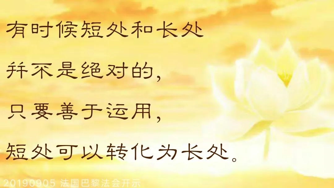 这个故事告诉你们,有时候短处和长处并不是绝对的,只要善于运用,短处可以转化为长处。你看我们学佛的人,很多人嘴巴很会讲,但是他自己不会写,你就让他去度人,他没几分钟就把人家度好了;很多人肚子里都知道,“师父教我的,要好好地学佛、修心、许愿、放生……”什么都知道,一跟人家讲,“……”;很多人嘴巴不会讲,但是他很会写,他就在网上发布那些弘法度人的东西,他一发出去之后,很多人就跟着他学了。所以每个人的长短处都不一样,有时候并不是绝对的。我们短处也可以转化为长处,关键是具备智慧和眼光,试着从各种角度去看待同一个问题。