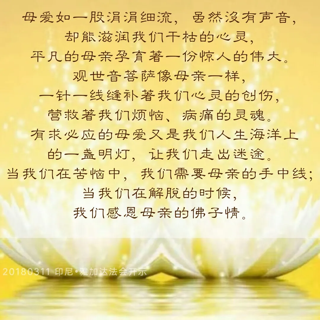 学佛人就如同找到自己的母亲一样,不学佛的人就像一个没有母亲的孩子,在工作上、事业上、感情上、身体上没人照顾,到处碰壁。我们学佛人要像找到母亲一样,让自己的心得到温暖。