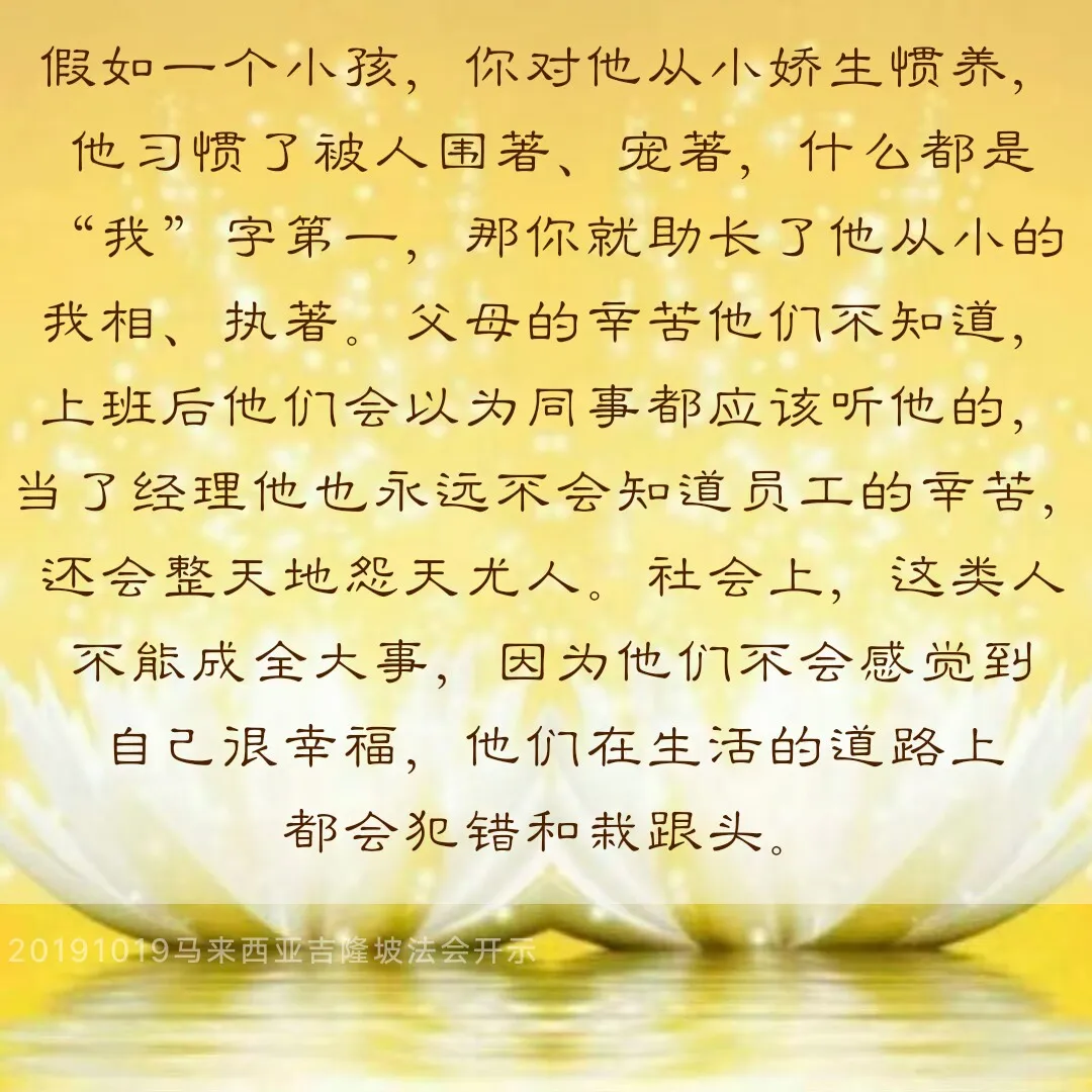 这个故事就是告诉我们,假如一个小孩,你对他从小娇生惯养,他习惯了被人围着、宠着,什么都是“我”字第一,那你就助长了他从小的我相、执著。父母的辛苦他们不知道,上班后他们会以为同事都应该听他的,当了经理他也永远不会知道员工的辛苦,还会整天地怨天尤人。社会上,这类人不能成全大事,因为他们不会感觉到自己很幸福,他们在生活的道路上都会犯错和栽跟头。