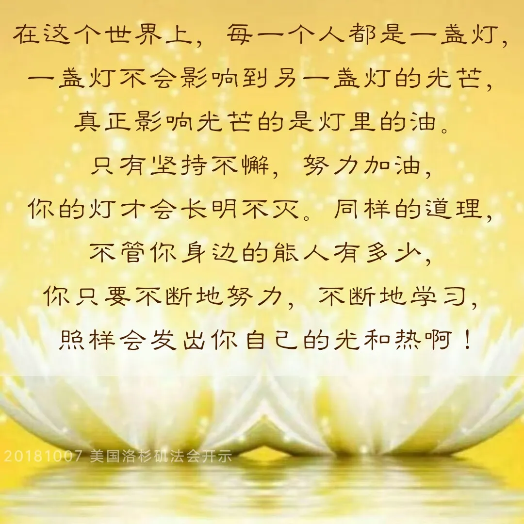 师父告诉他:“在这个世界上,每一个人都是一盏灯,一盏灯不会影响到另一盏灯的光芒,真正影响光芒的是灯里的油。只有坚持不懈,努力加油,你的灯才会长明不灭。同样的道理,不管你身边的能人有多少,你只要不断地努力,不断地学习,照样会发出你自己的光和热啊!”