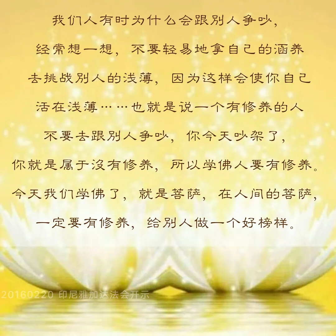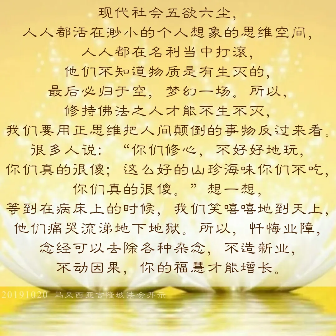 现代社会五欲六尘,人人都活在渺小的个人想象的思维空间,人人都在名利当中打滚,他们不知道物质是有生灭的,最后必归于空,梦幻一场。所以,修持佛法之人才能不生不灭,我们要用正思维把人间颠倒的事物反过来看。很多人说:“你们修心,不好好地玩,你们真的很傻;这么好的山珍海味你们不吃,你们真的很傻。”想一想,等到在病床上的时候,我们笑嘻嘻地到天上,他们痛哭流涕地下地狱。所以,忏悔业障,念经可以去除各种杂念,不造新业,不动因果,你的福慧才能增长。