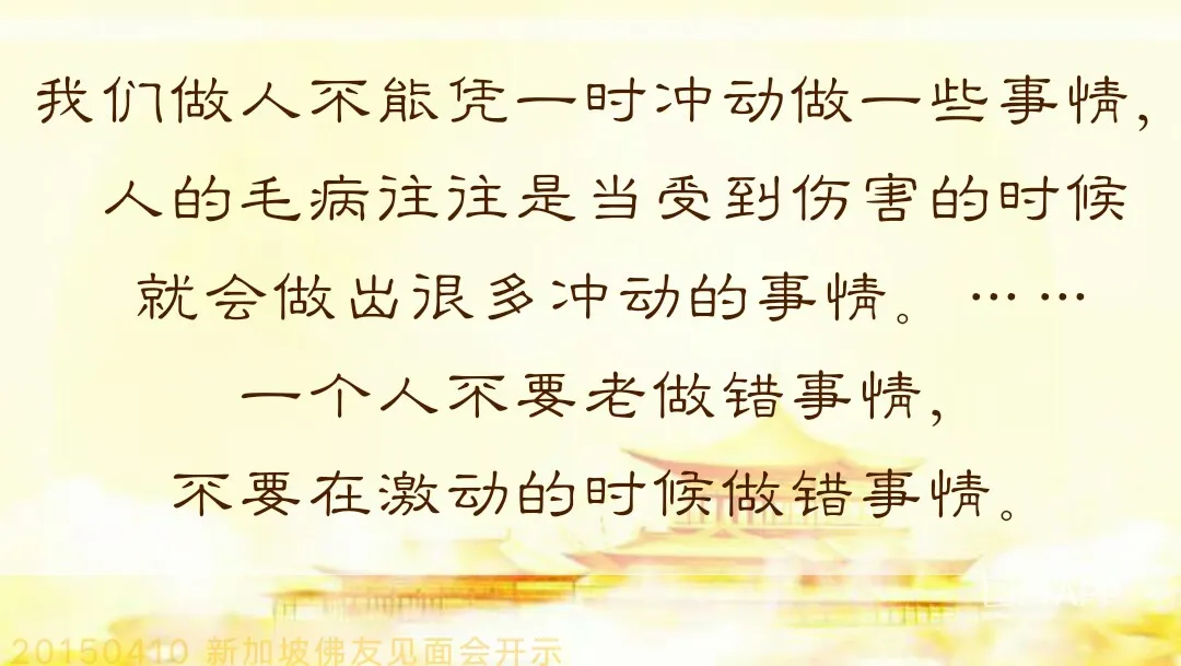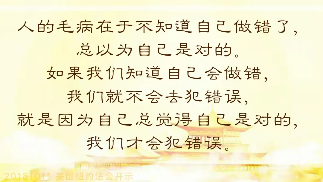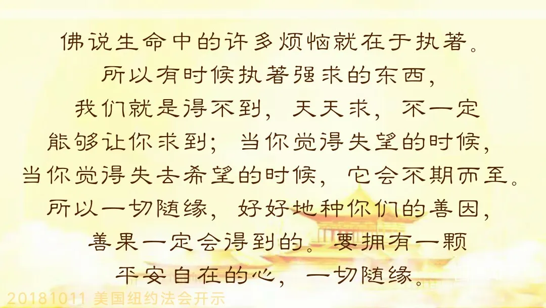 人的毛病在于不知道自己做错了,总以为自己是对的。如果我们知道自己会做错,我们就不会去犯错误,就是因为自己总觉得自己是对的,我们才会犯错误。佛说生命中的许多烦恼就在于执著。所以有时候执著强求的东西,我们就是得不到,天天求,不一定能够让你求到;当你觉得失望的时候,当你觉得失去希望的时候,它会不期而至。所以一切随缘,好好地种你们的善因,善果一定会得到的。要拥有一颗平安自在的心,一切随缘。