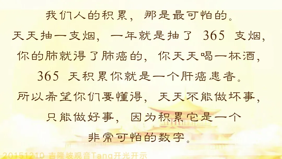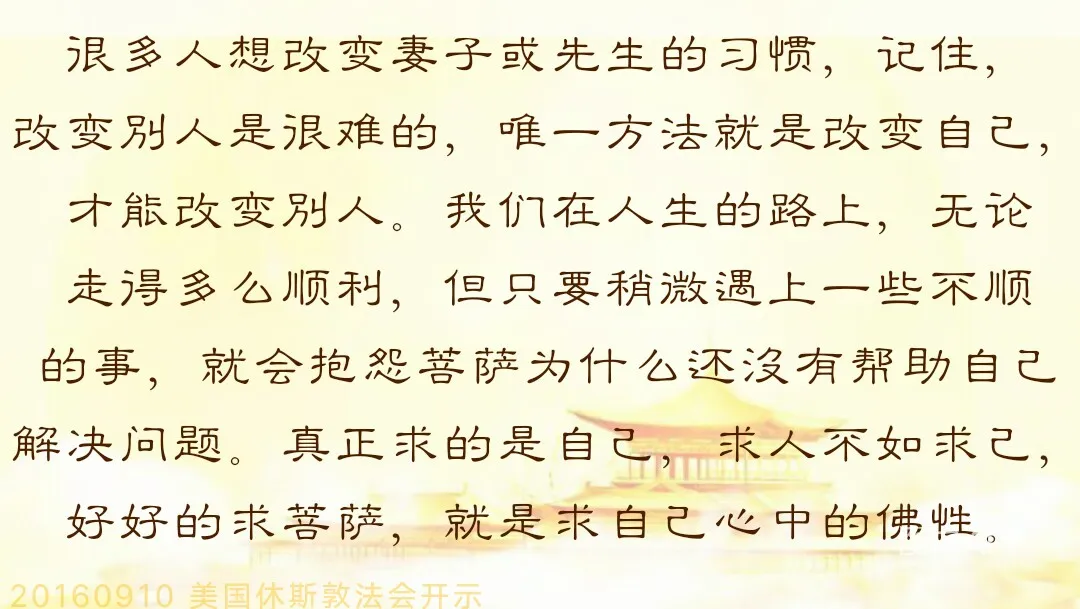 这个故事告诉大家,很多人想改变妻子或先生的习惯,记住,改变别人是很难的,唯一方法就是改变自己,才能改变别人。我们在人生的路上,无论走得多么顺利,但只要稍微遇上一些不顺的事,就会抱怨菩萨为什么还没有帮助自己解决问题。真正求的是自己,求人不如求己,好好的求菩萨,就是求自己心中的佛性。