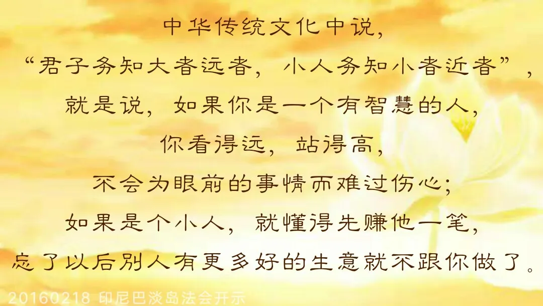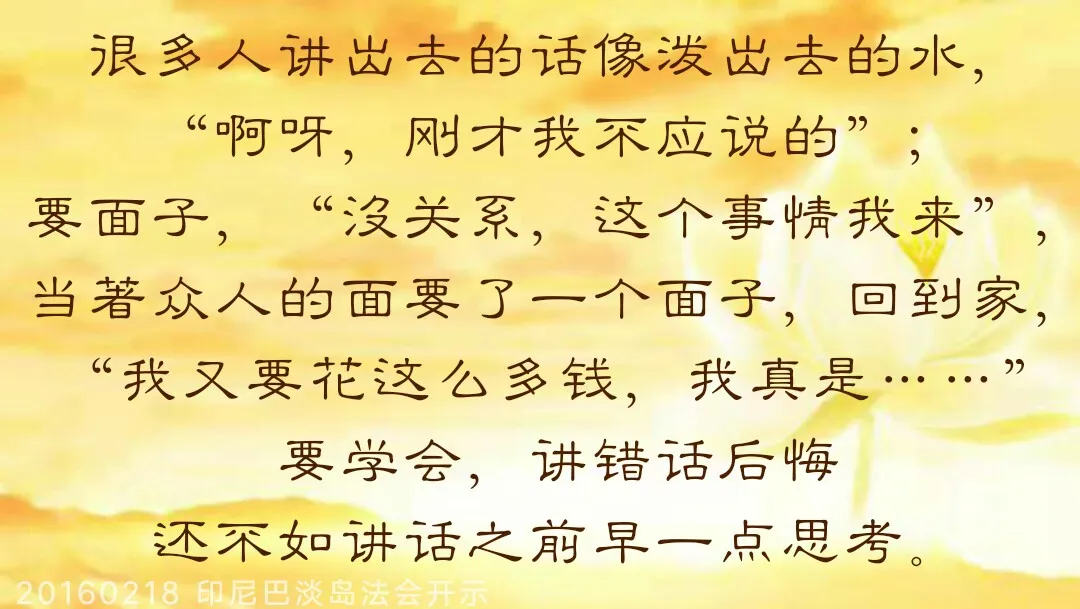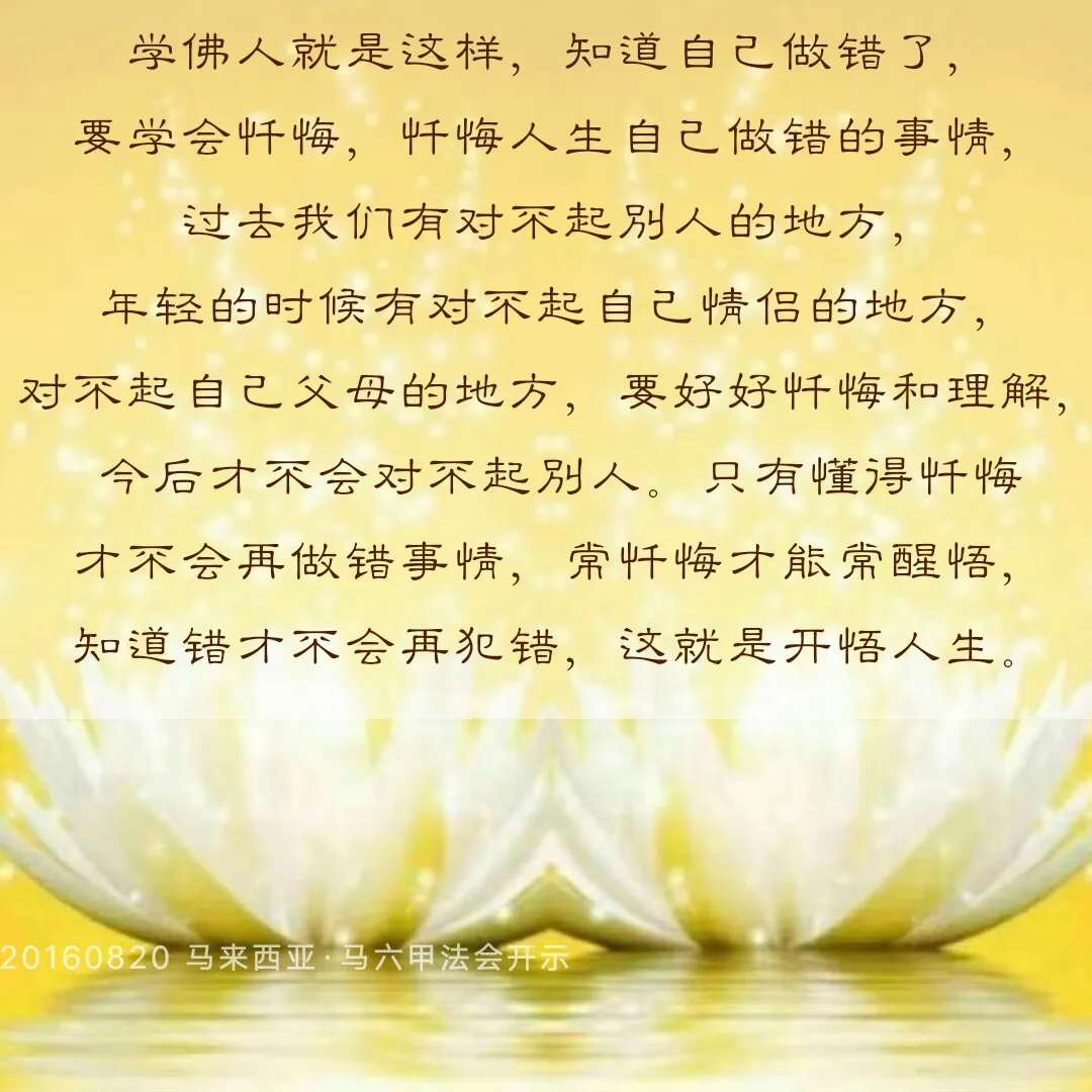学佛人就是这样,知道自己做错了,要学会忏悔,忏悔人生自己做错的事情,过去我们有对不起别人的地方,年轻的时候有对不起自己情侣的地方,对不起自己父母的地方,要好好忏悔和理解,今后才不会对不起别人。只有懂得忏悔才不会再做错事情,常忏悔才能常醒悟,知道错才不会再犯错,这就是开悟人生。