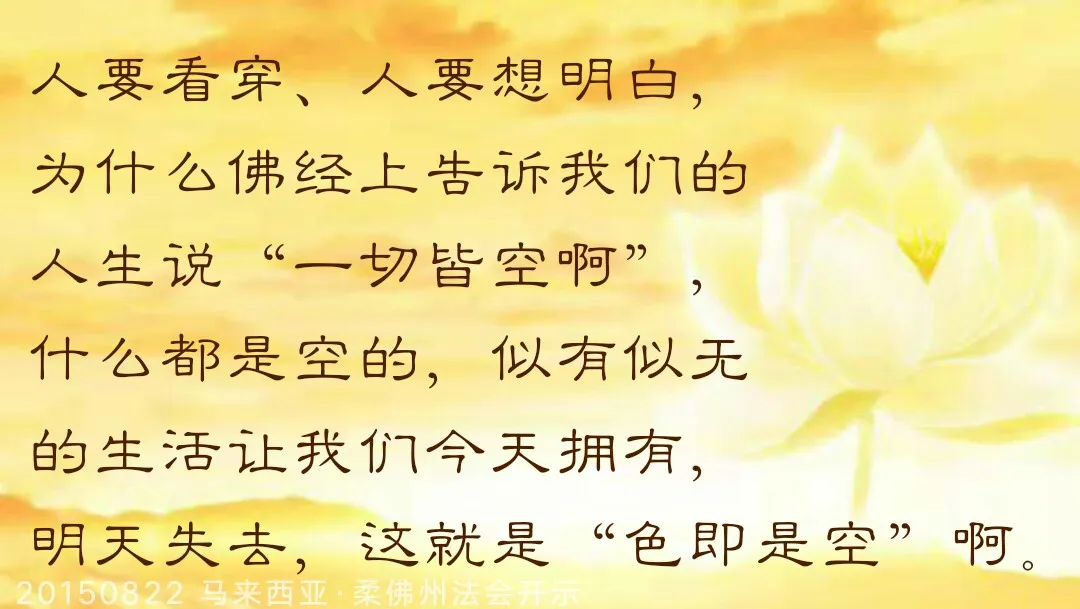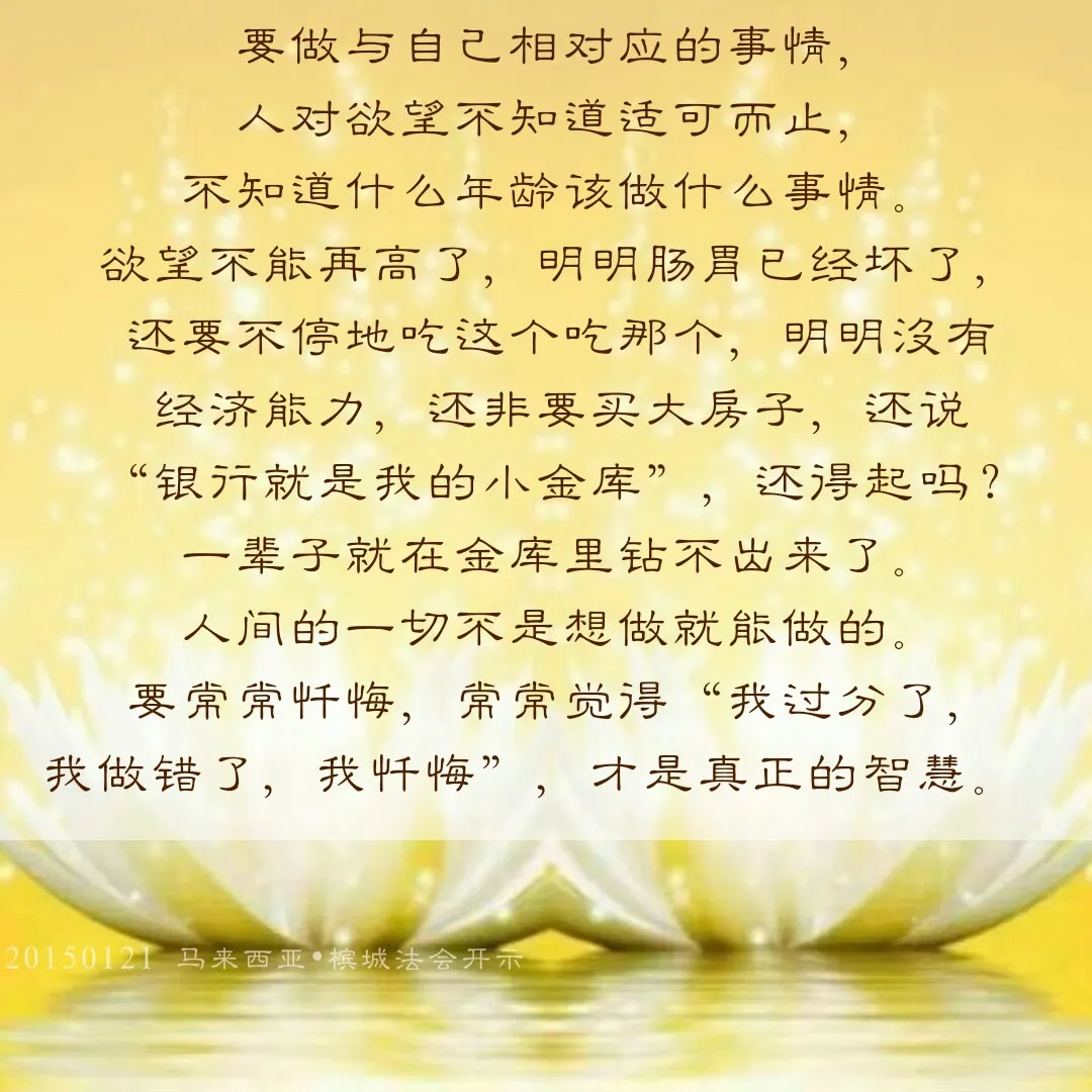75 岁的老人找一个 25 岁的妻子,记性不好连家都记不住,就算拥有了也会失去。要做与自己相对应的事情,人对欲望不知道适可而止,不知道什么年龄该做什么事情。欲望不能再高了,明明肠胃已经坏了,还要不停地吃这个吃那个,明明没有经济能力,还非要买大房子,还说“银行就是我的小金库”,还得起吗?一辈子就在金库里钻不出来了。人间的一切不是想做就能做的。要常常忏悔,常常觉得“我过分了,我做错了,我忏悔”,才是真正的智慧