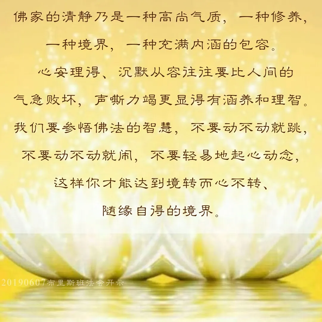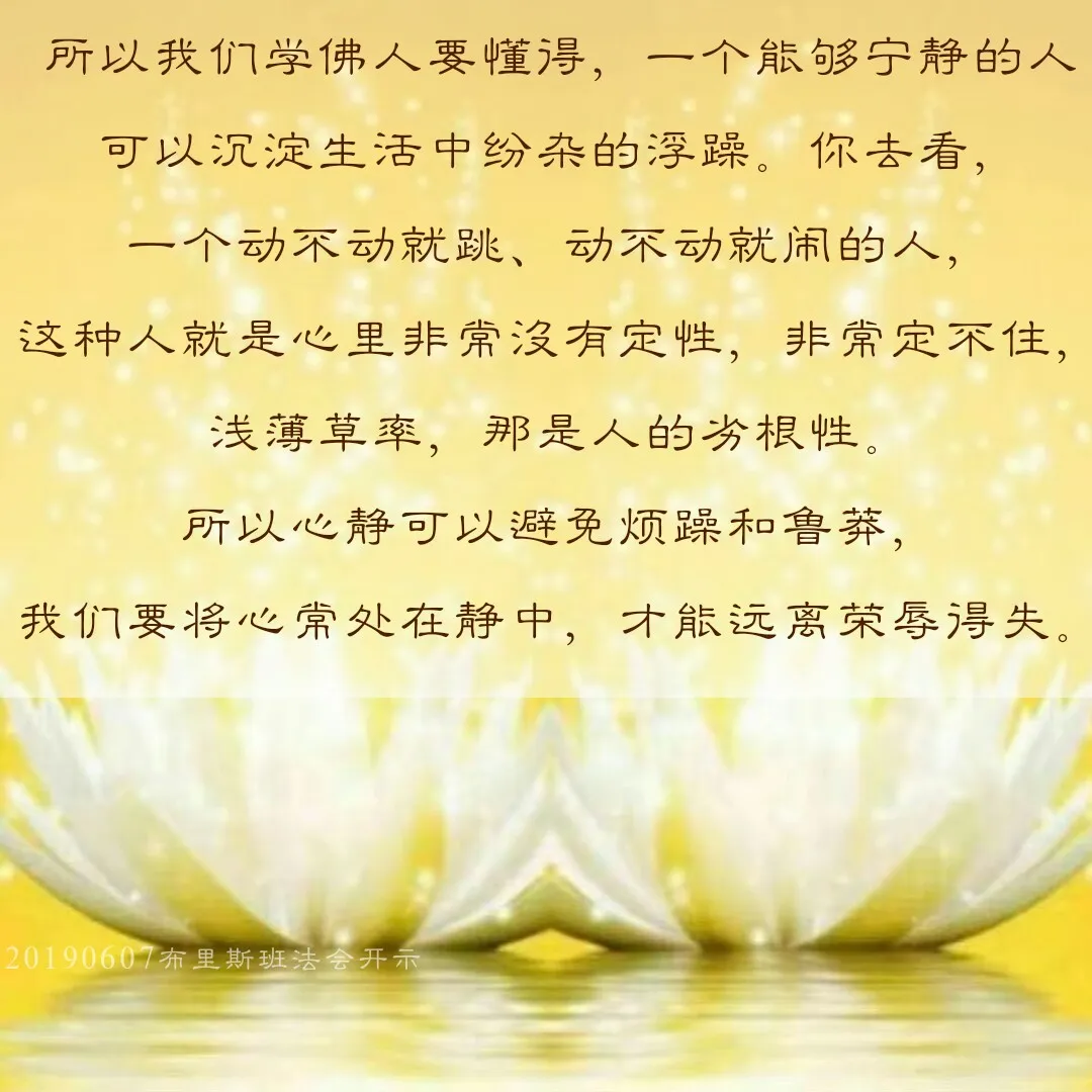 所以我们学佛人要懂得,一个能够宁静的人可以沉淀生活中纷杂的浮躁。你去看,一个动不动就跳、动不动就闹的人,这种人就是心里非常没有定性,非常定不住,浅薄草率,那是人的劣根性。所以心静可以避免烦躁和鲁莽,我们要将心常处在静中,才能远离荣辱得失。佛家的清静乃是一种高尚气质,一种修养,一种境界,一种充满内涵的包容。心安理得、沉默从容往往要比人间的气急败坏,声嘶力竭更显得有涵养和理智。我们要参悟佛法的智慧,不要动不动就跳,不要动不动就闹,不要轻易地起心动念,这样你才能达到境转而心不转、随缘自得的境界。
