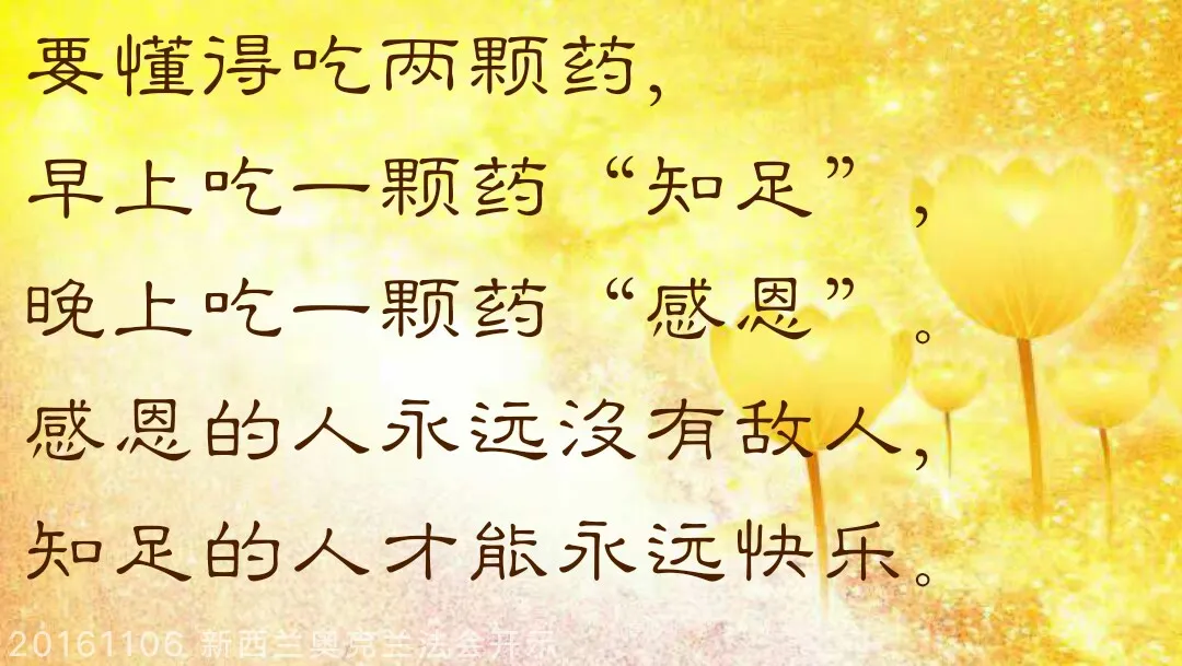 要懂得吃两颗药,早上吃一颗药“知足”,晚上吃一颗药“感恩”。感恩的人永远没有敌人,知足的人才能永远快乐。 有个信徒天天想发财,有一天他对上帝说:“万能的上帝啊,一万年对您来说有多长呢?” 上帝说:“我眨一下眼的功夫。”信徒又说:“那么10亿元是什么概念呢?”上帝说:“不过是我的一根头发而已。”信徒说:“慈悲的上帝啊,那就请您给我一根头发吧。”上帝说:“没 问题,等我眨一下眼之后就给你。”这个笑话告诉大家,做人不能贪,因为贪就会贫,越贪越贫,所以知足者快乐。