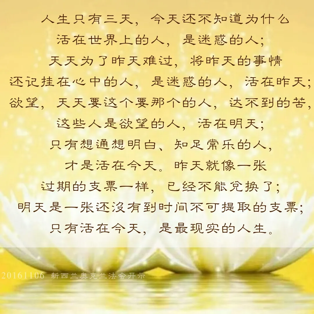 人生只有三天,今天还不知道为什么活在世界上的人,是迷惑的人;天天为了昨天难过,将昨天的事情还记挂在心中的人,是迷惑的人,活在昨天;欲望,天天要这个要那个的人,达不到的苦,这些人是欲望的人,活在明天;只有想通想明白、知足常乐的人,才是活在今天。昨天就像一张过期的支票一样,已经不能兑换了;明天是一张还没有到时间不可提取的支票;只有活在今天,是最现实的人生。
