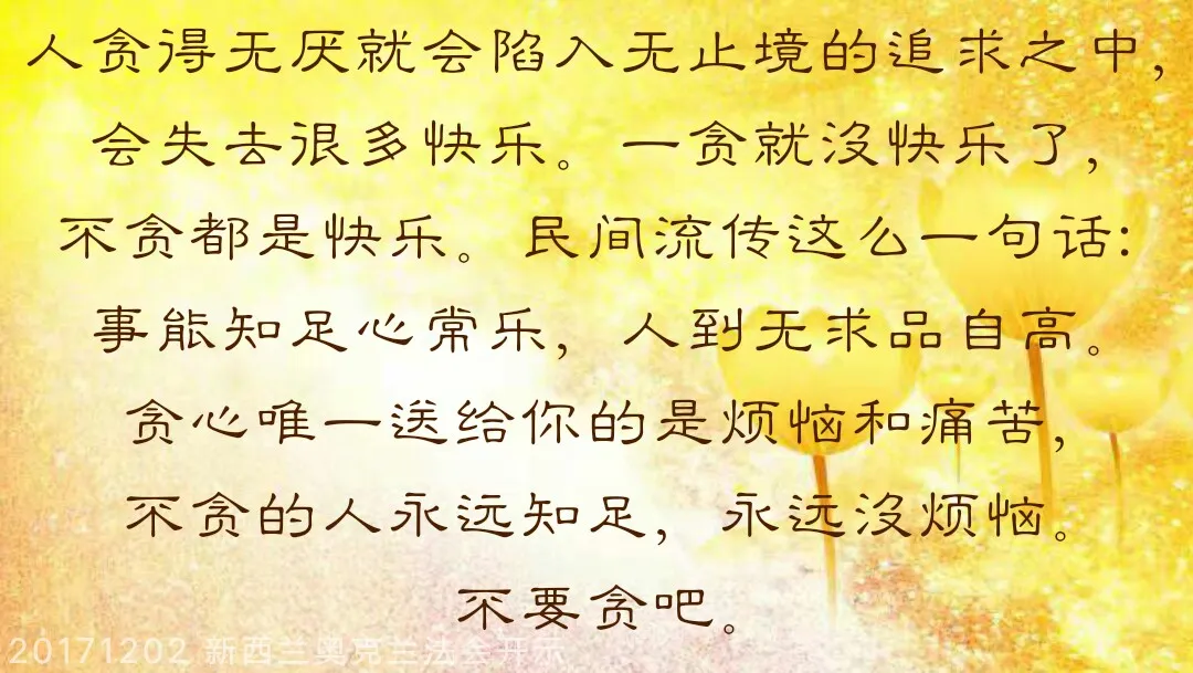 人生最忌讳的一个事情就是贪,贪得无厌。很多女孩子本来有一个男朋友很好的,后来看到别人觉得比自己的男友好,就跟别人好了,结果被这个人甩了。我上次说了一个现代笑话,一个女孩子说:“我想找一个又有钱、又能够爱我照顾我的人,还要长得很漂亮的。”对方就跟她讲:“那你必须要结三次婚。”一个人怎么可能拥有这么多的优点?有钱的人不一定爱你,爱你的人不一定有钱,有钱的人不一定好看,好看的人不一定有钱。想三个都要,那就结三次婚。人贪得无厌就会陷入无止境的追求之中,会失去很多快乐。一贪就没快乐了,不贪都是快乐。民间流传这么一句话:事能知足心常乐,人到无求品自高。贪心唯一送给你的是烦恼和痛苦,不贪的人永远知足,永远没烦恼。不要贪吧。