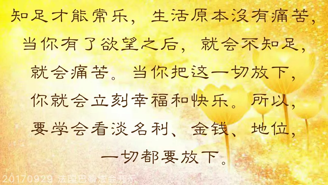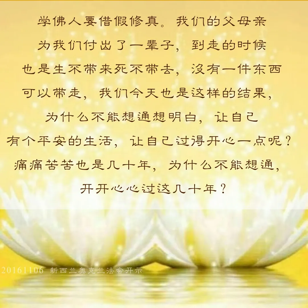 学佛人要借假修真。我们的父母亲为我们付出了一辈子,到走的时候也是生不带来死不带去,没有一件东西可以带走,我们今天也是这样的结果,为什么不能想通想明白,让自己有个平安的生活,让自己过得开心一点呢?痛痛苦苦也是几十年,为什么不能想通, 开开心心过这几十年?