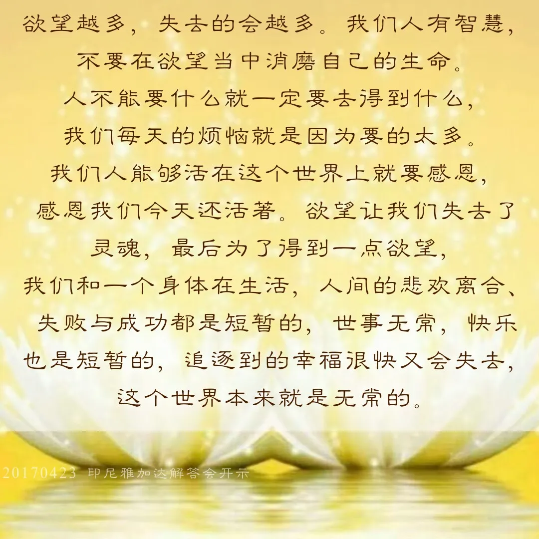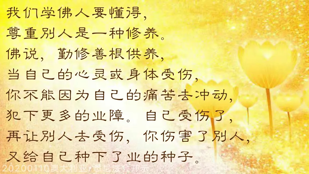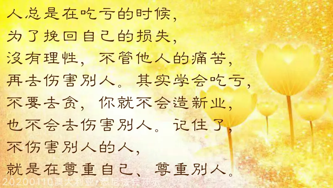 这个故事就是告诉你们:人总是在吃亏的时候,为了挽回自己的损失,没有理性,不管他人的痛苦,再去伤害别人。其实学会吃亏,不要去贪,你就不会造新业,也不会去伤害别人。记住了,不伤害别人的人,就是在尊重自己、尊重别人。我们学佛人要懂得,尊重别人是一种修养。佛说,勤修善根供养,当自己的心灵或身体受伤,你不能因为自己的痛苦去冲动,犯下更多的业障。自己受伤了,再让别人去受伤,你伤害了别人,又给自己种下了业的种子。
