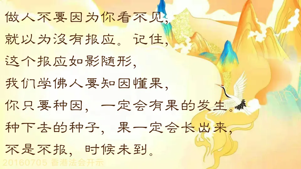 这个故事就是告诉我们:做人不要因为你看不见,就以为没有报应。记住,这个报应如影随形,我们学佛人要知因懂果,你只要种因,一定会有果的发生。种下去的种子,果一定会长出来,不是不报,时候未到。