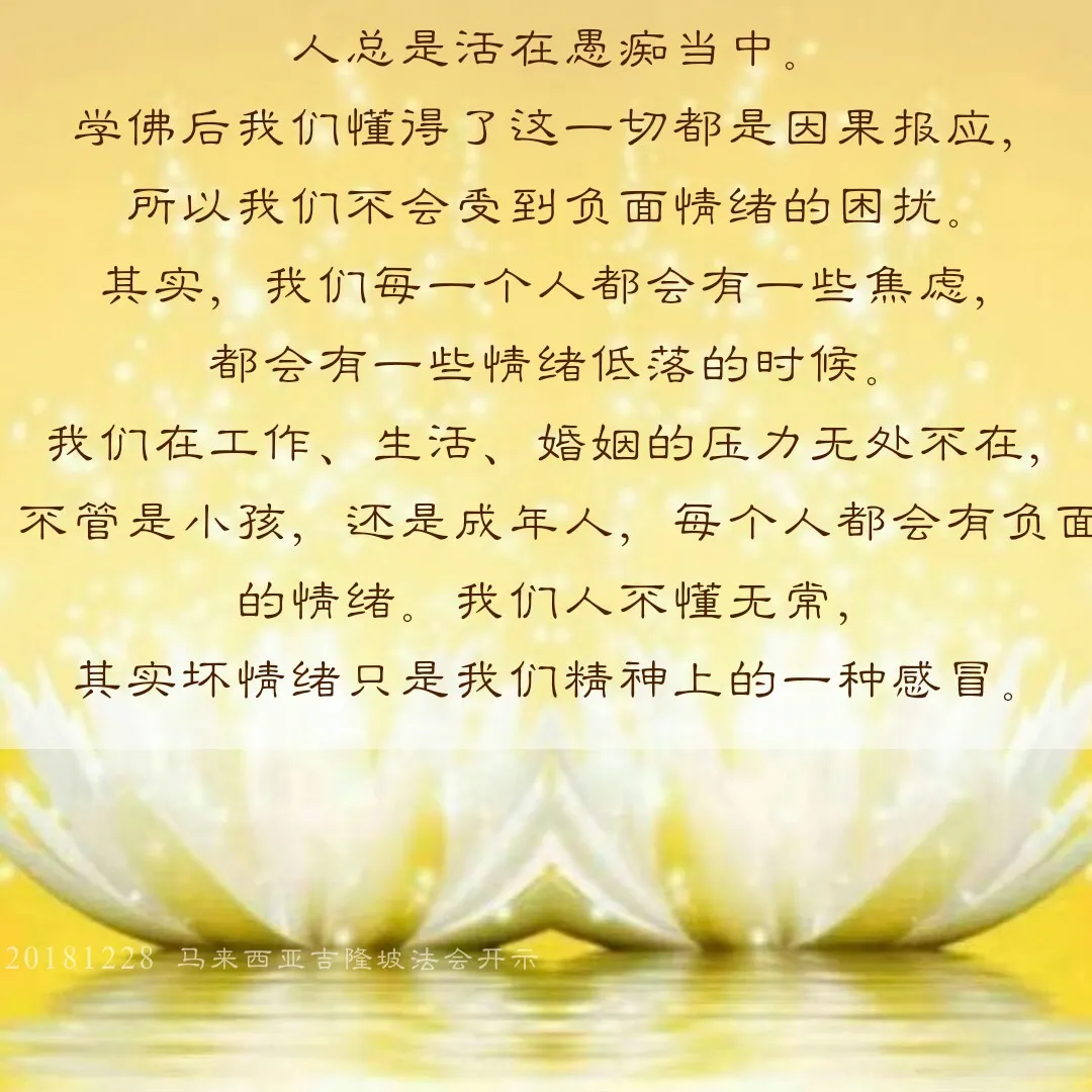 人总是活在愚痴当中。学佛后我们懂得了这一切都是因果报应,所以我们不会受到负面情绪的困扰。其实,我们每一个人都会有一些焦虑,都会有一些情绪低落的时候。我们在工作、生活、婚姻的压力无处不在,不管是小孩,还是成年人,每个人都会有负面的情绪。我们人不懂无常,其实坏情绪只是我们精神上的一种感冒。